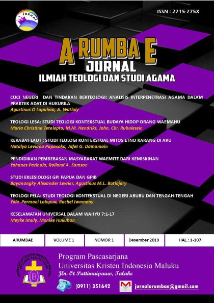 Arumbae: Jurnal Ilmiah Teologi dan Studi Agama yang dikelola oleh Program Pascasarjana UKIM, kembali menyapa pembaca publik dengan menyajikan sebelas artikel yang telah melalui seluruh proses submission hingga publikasi. Kesebelas artikel ini menyajikan beragam isu berteologi dan studi agama. Publikasi ini diawali dengan kajian mengenai Ijtihad Muhammadiyah dan Relevansinya dalam menyikapi problem kontemporer. Selanjutnya, beberapa artikel menganalisis konsep berteologi kontekstual dari beragam konteks, seperti konteks pertumbuhan gereja, Kunci Negeri dan ekoteologi di Maluku, tradisi Saroan di Toraja, Ritual Mambere Mangan Nadob Matei di Simalungun, dan Perjuangan Keadilan di Aitinyo Papua Barat. Ada juga beberapa artikel analisis Biblis kontekstual, konstruksi teoritik agama dan kebangsaan, hingga dua artikel terakhir yang membahas mengenai misi gereja dalam konteks pembebasan Pria Feminin dan Pemberdayaan Pemulung. Semoga publikasi kali ini juga menambah khasana kajian ilmiah teologi dan studi agama. Selamat membaca